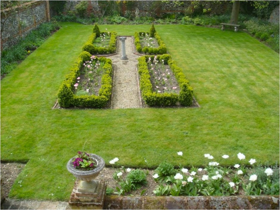 The walled garden of an eighteenth century house. The house overlooked an uninteresting rectangular lawn, which was transformed by the addition of a wide gravel terrace with steps flanked by stone urns on plinths. Year round interest has been created by the new knot garden and sundial, the box hedging seen here awaiting their first trim in early June; the inner beds are planted with Angelique tulips. Knot gardens and parterres look best when seen from above as this one is from the upstairs bedrooms.