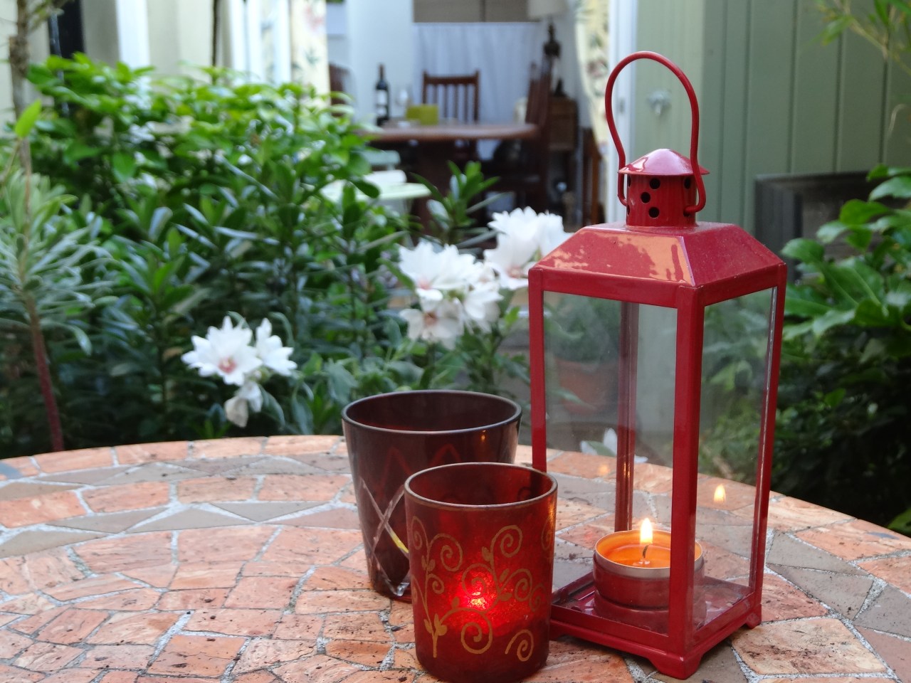 Outdoor downlighters are supplemented by candle lit lanterns. Even in winter, when the French doors from the kitchen are tightly closed, there is always a pleasant outlook.